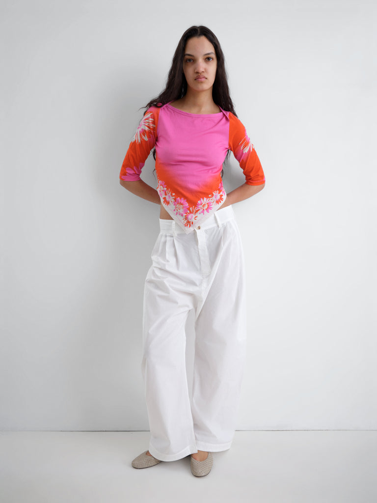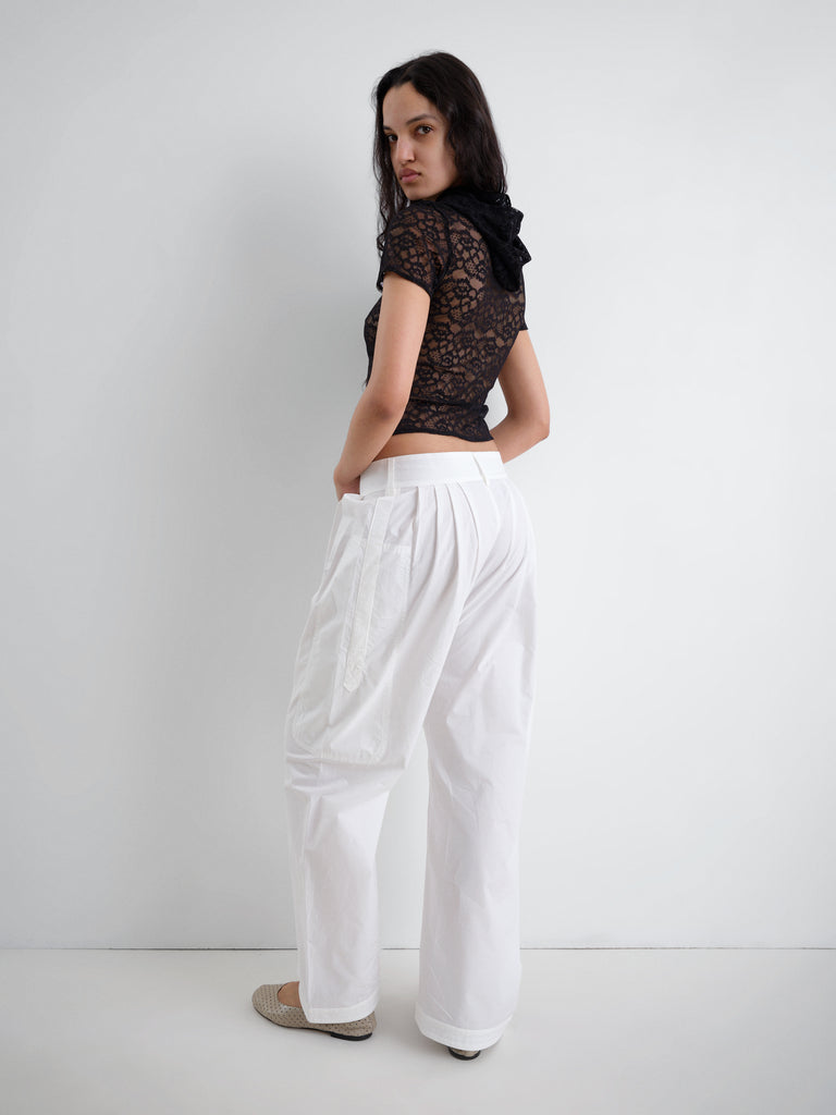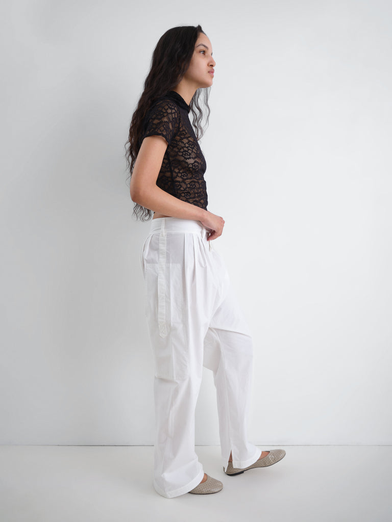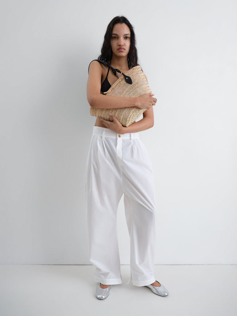 White poplin pants. Designed for women and men with a carrot fit and low rise. Features side pleats for added volume, a dropped crotch, crescent-cut side pockets, and a cuffed hem in matching fabric.