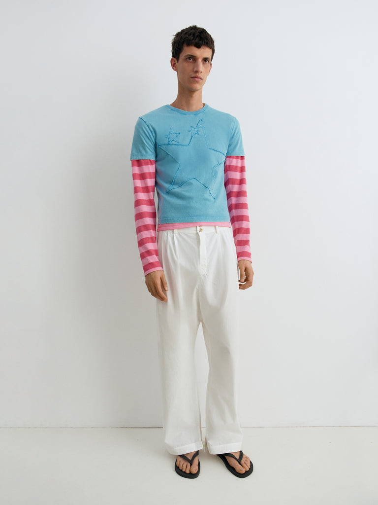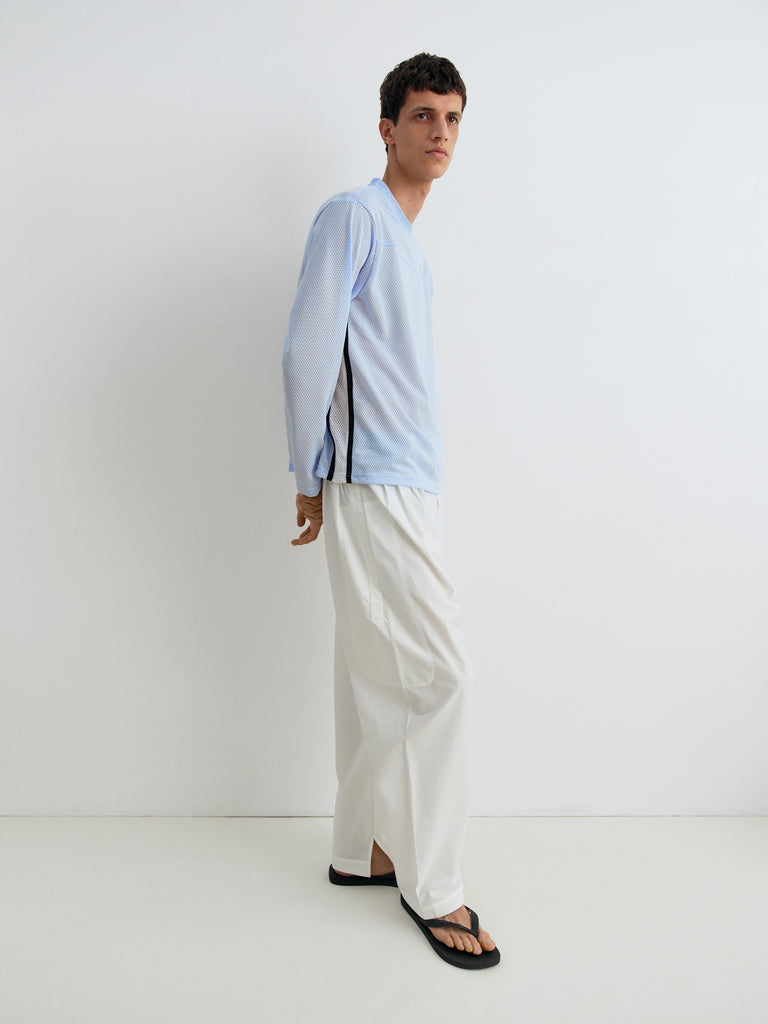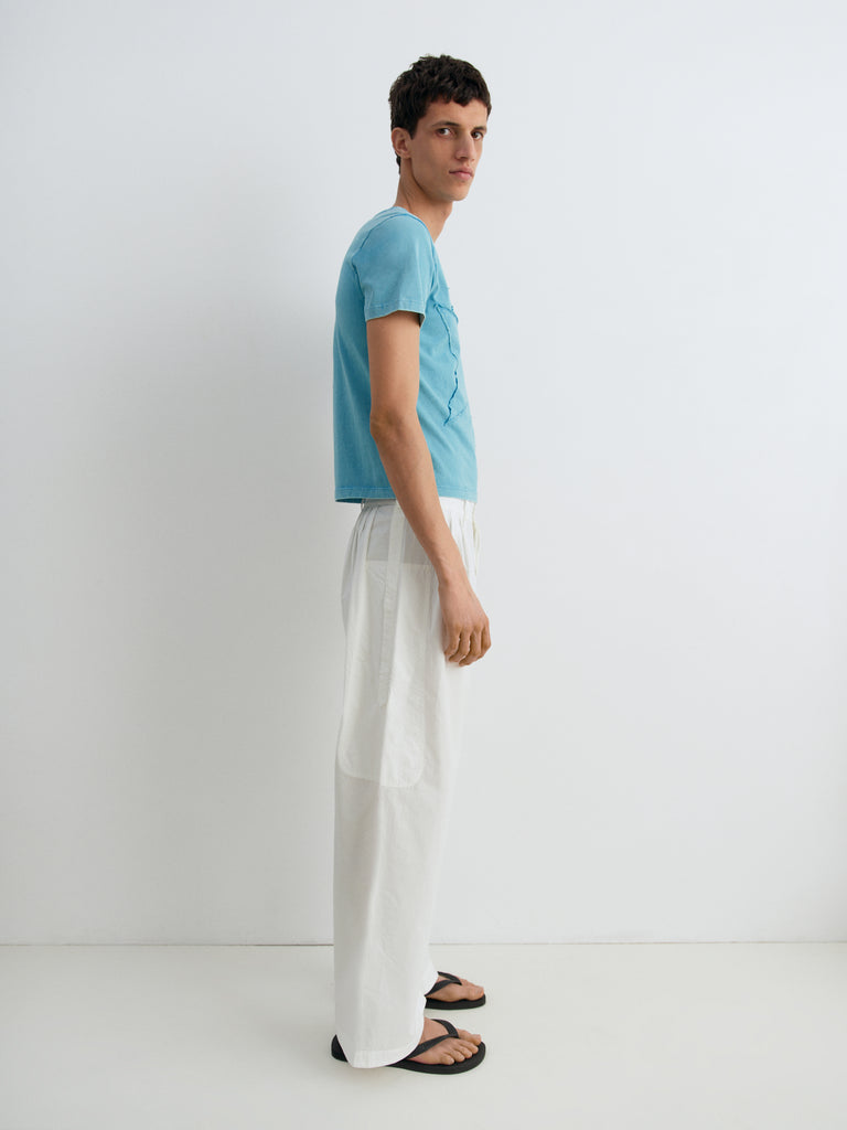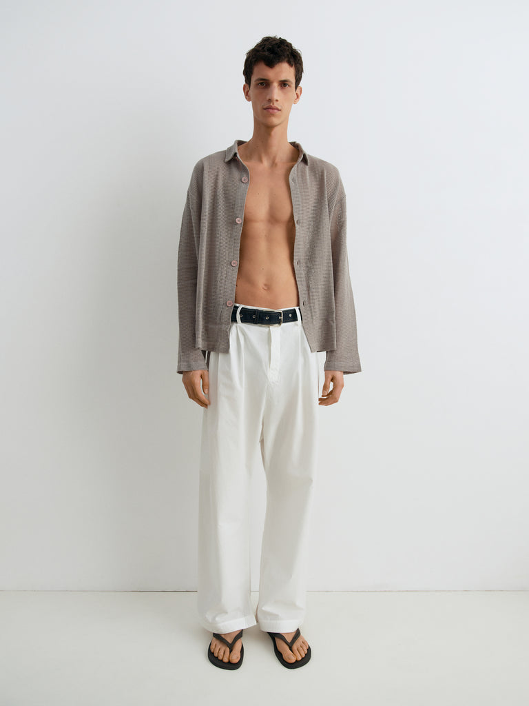 White poplin pants. Designed for women and men with a carrot fit and low rise. Features side pleats for added volume, a dropped crotch, crescent-cut side pockets, and a cuffed hem in matching fabric.