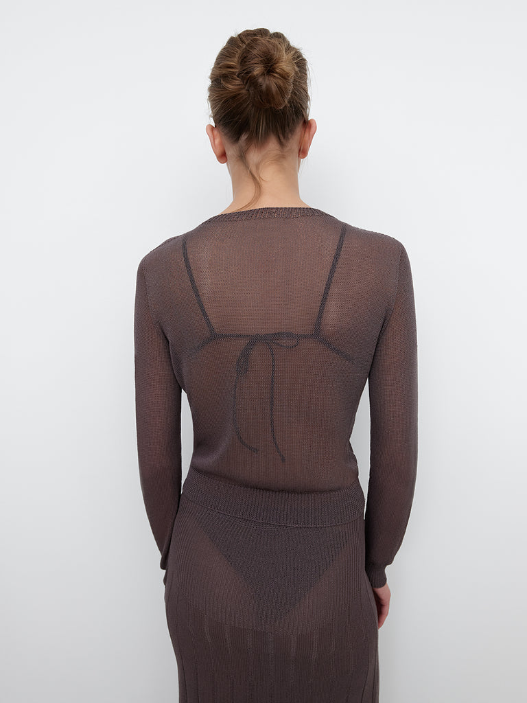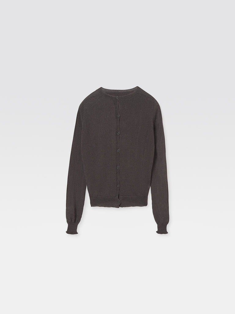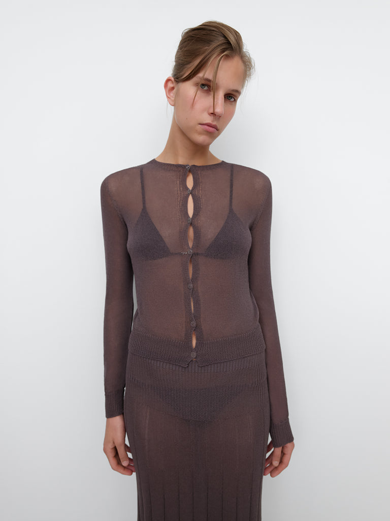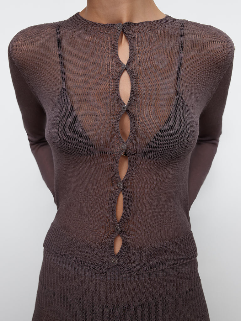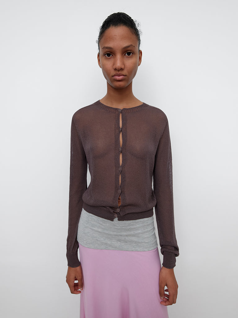 Women's knit cardigan in brown. Round neckline, long sleeves, and tonal front buttons. Ribbed trims at collar and cuffs. Lightweight open-knit texture for an airy feel.