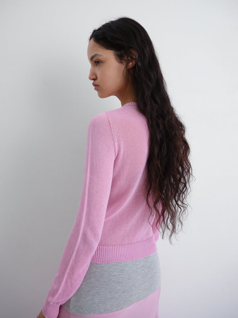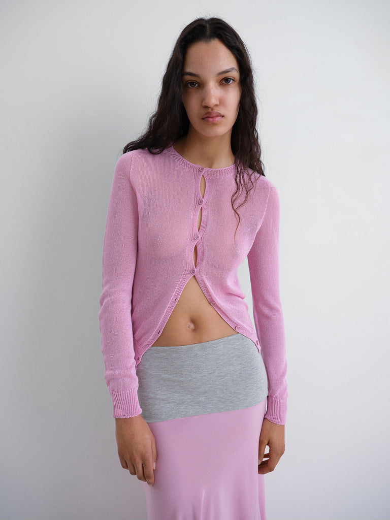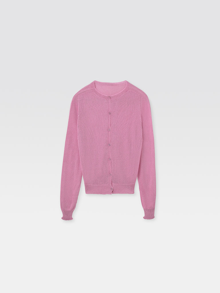 Women's knit cardigan in pink. Round neckline, long sleeves, and tonal front buttons.