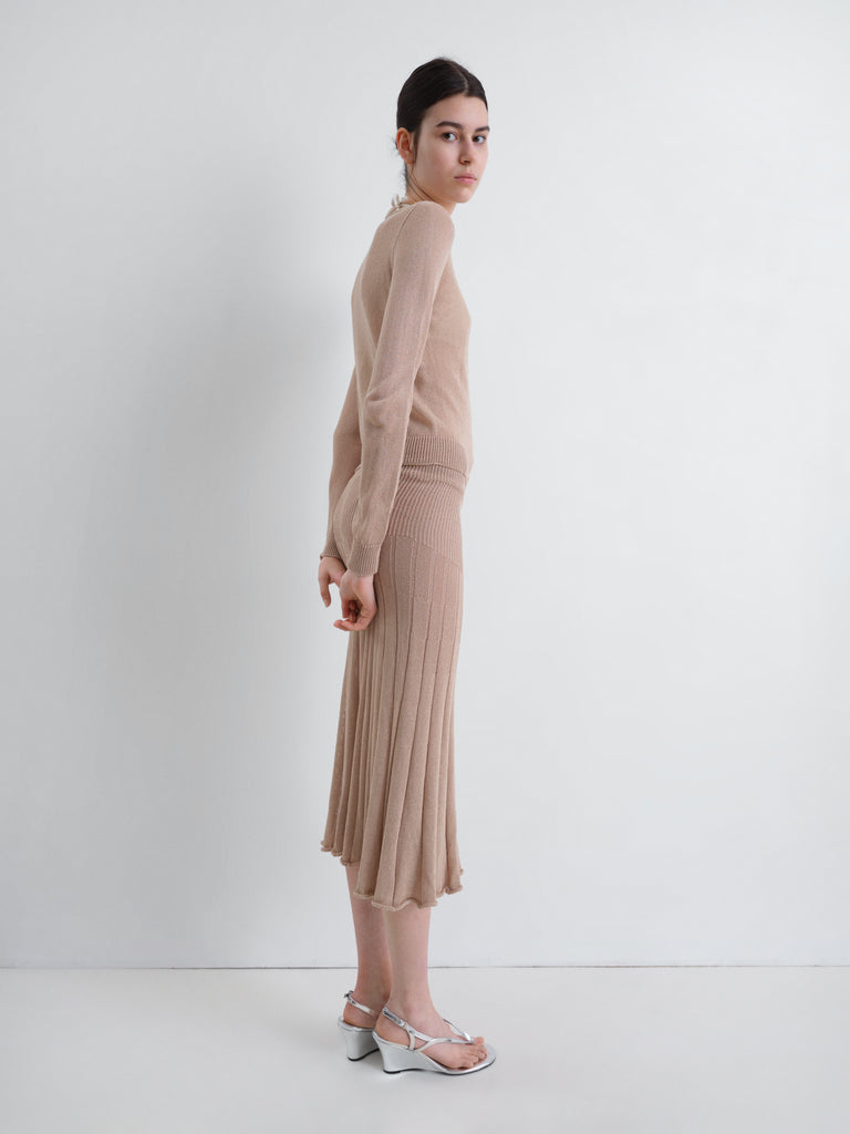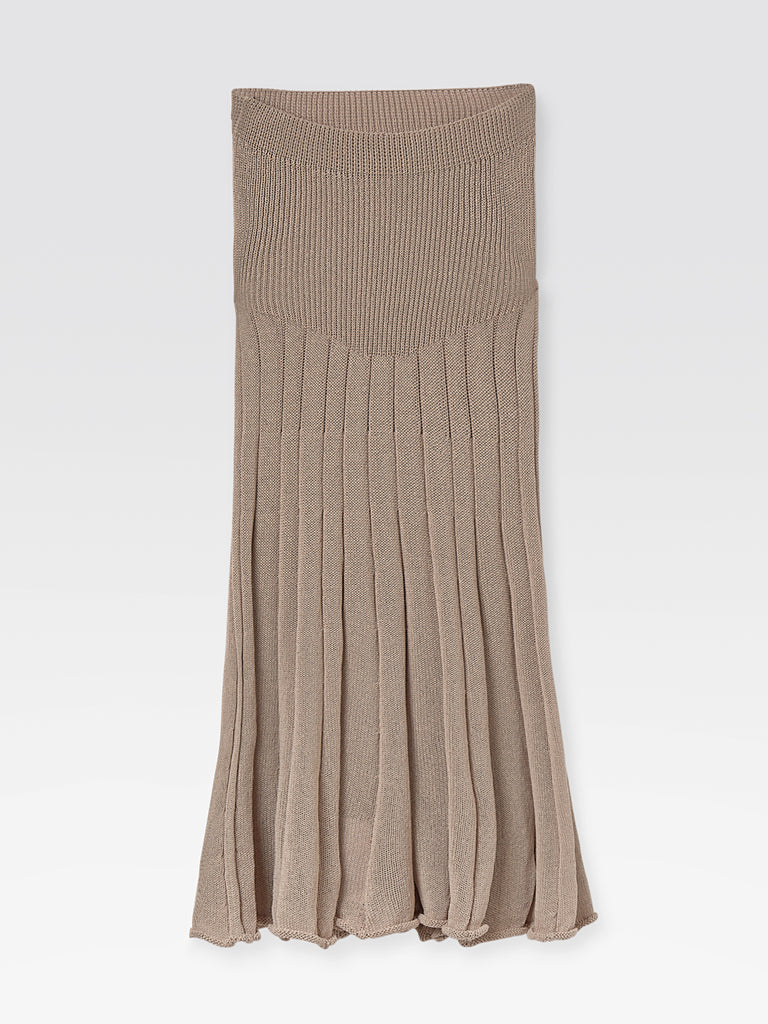 Women's beige midi knit skirt. Designed with a ribbed high waistband and structured pleats that flow into a flared hem. The soft, elastic knit ensures a fluid drape.
