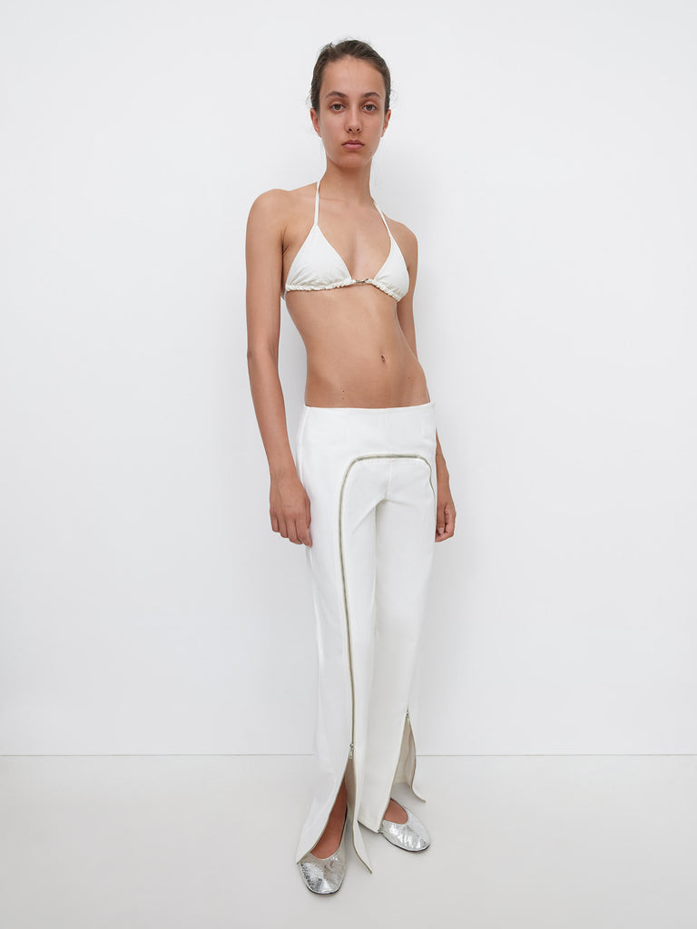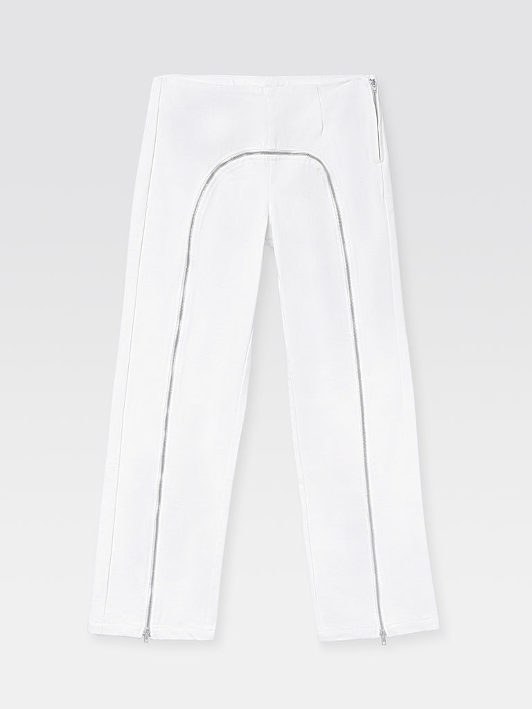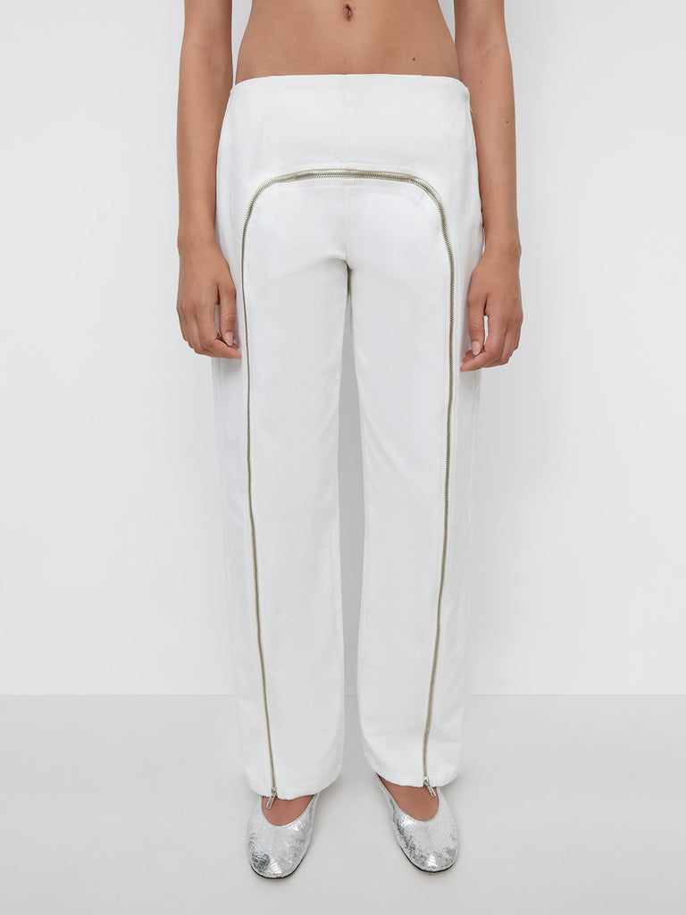 Off-white women's oversized cotton twill pants. Designed in a loose fit with a statement front metal zipper from side to side. Features an interior fabric-lined waistband.